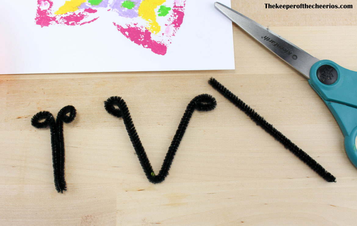 - Take the black pipe cleaner and cut in thirds. Bend one piece into a “V” shape and curl the ends. Push the V together to form the body. Glue onto the middle of the butterfly and add 2 googly eyes.