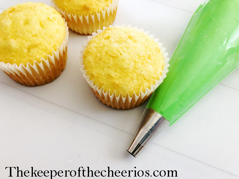 4. Let your cupcakes cool and mix together the jar of yellow frosting with 1/4-1/2 jar of blue frosting to make a bright green color.