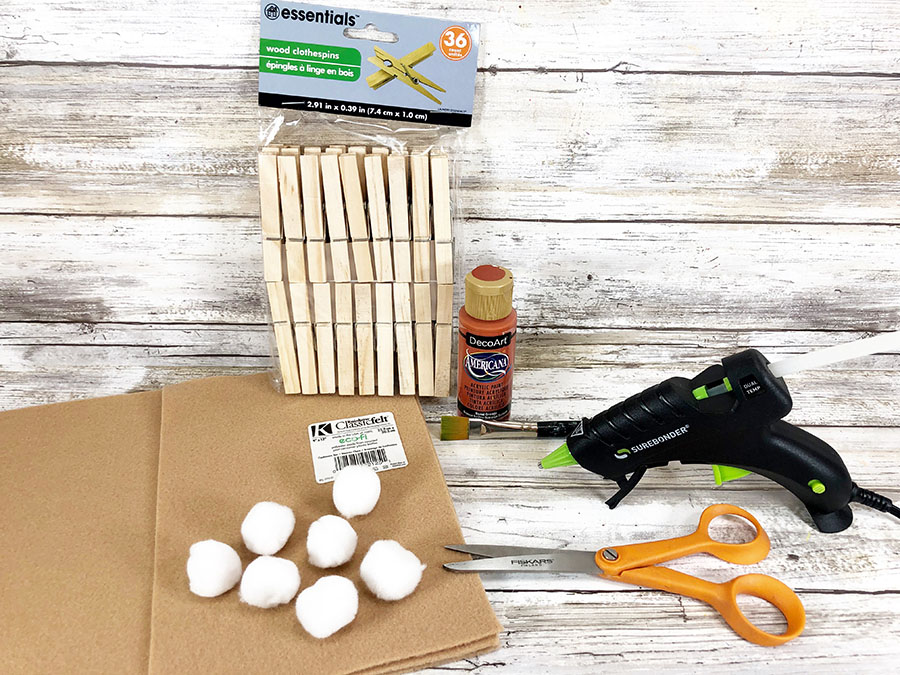 Gather all supplies. Remove the metal spring from the wooden clothespins. Line up three full clothespins on your work surface, to create a wedge shape. Attach the wooden clothespin pieces together with a glue gun and glue sticks, using the photo as a template.