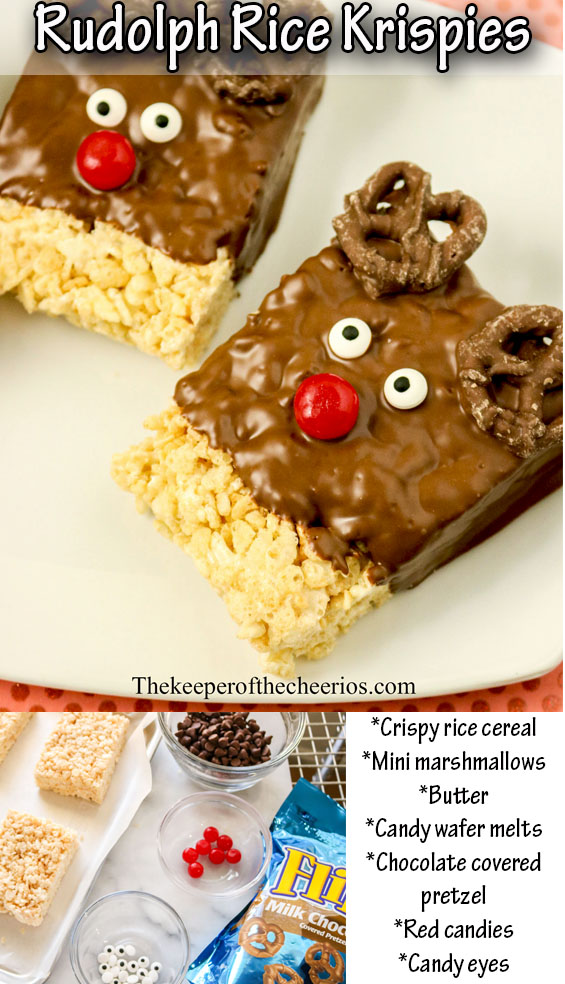7. Spread melted candy over ⅔ of each krispie treat and decorate to resemble a reindeer.