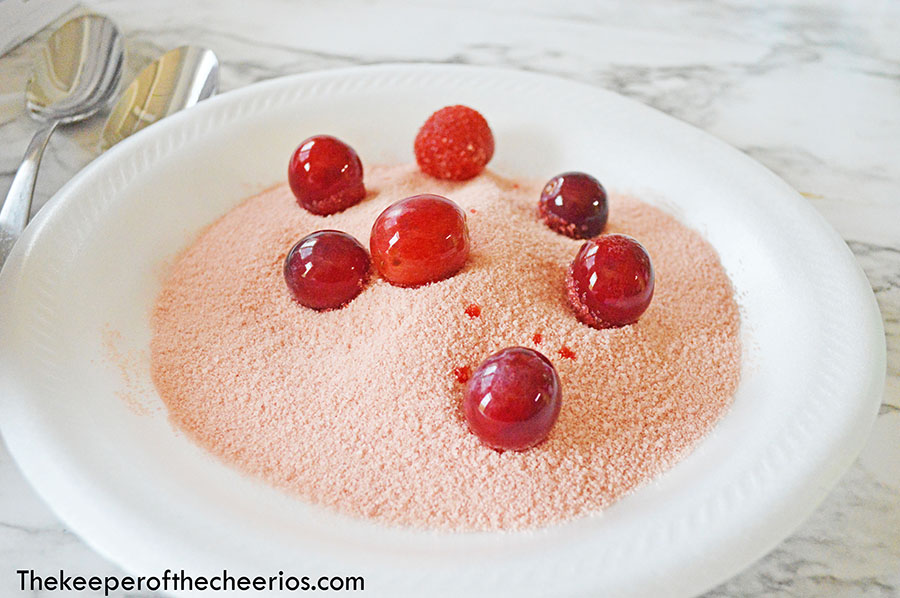 Remove all of the grapes from the stems and rinse well in a colander. Shake off excess water. Prepare two bowls by filling one with red grapes and one with green. Fill each to the top with water. You may have to do half of the grapes at a time, depending on the size bowls you use. You’ll keep the grapes in water until you get ready to roll them in the jello powder. Pour strawberry jello powder onto one plate and green apple jello powder to another. Line a baking sheet with parchment paper. Make sure your baking sheet is an appropriate size to fit inside your freezer! Take 5-6 grapes at a time and take them directly from the water to the jello powder. Do not shake off the excess water. Roll the grapes around in the powder until they are well coated. You can use toothpicks, tongs, or spoons to remove the grapes from the powder and set them onto the parchment paper baking sheet. Gently shake excess powder off of the grapes after coating. Repeat this process until all of the grapes have been coated or you run out of jello powder. Move the grapes to the freezer and freeze for 2 hours. At that point you can move the grapes into a freezer storage bag, and store frozen until ready to serve. As they thaw the jello colors may begin to mix, so keep frozen.