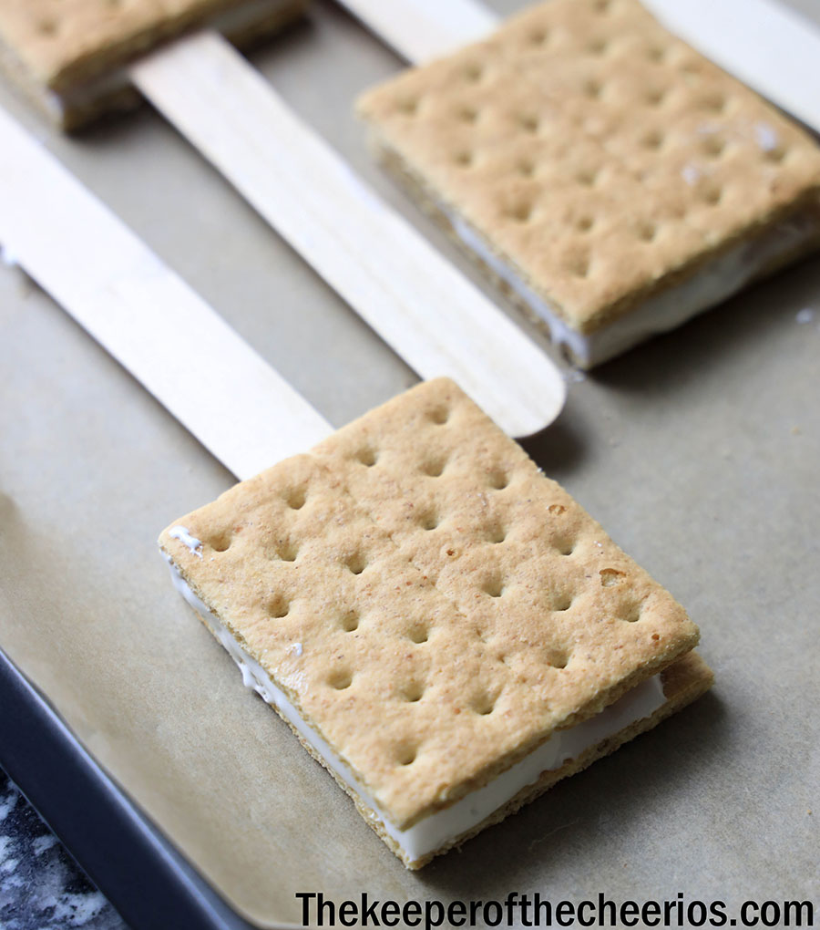 Place graham crackers on a baking sheet lined with parchment paper. Fill one side of each graham cracker half with marshmallow cream. Place the wood pop stick inside and place the other half on top. Freeze for 10 minutes.