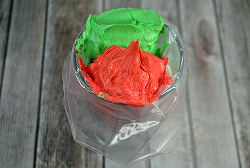 - Scoop the green frosting into the other side of the piping bag